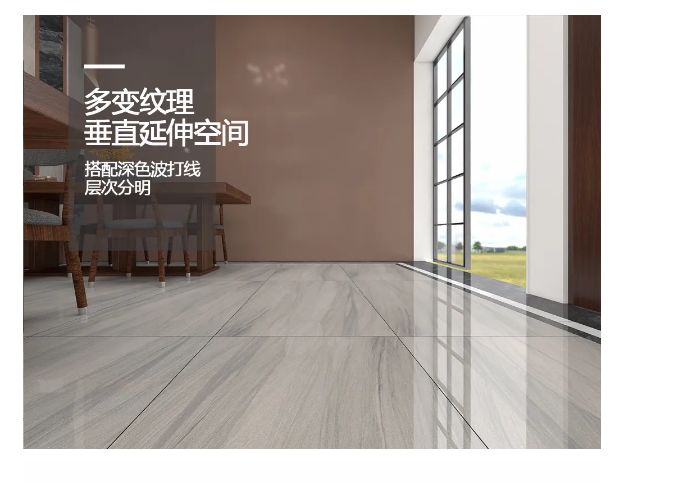 600x1200MM本身的尺寸和纹理效果是它最大的优势之一,用最简单的直铺贴方式,反而最能展示出600x1200MM纹理大气美观的效果,大面积铺贴,使空间更显大气开阔。